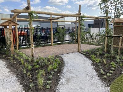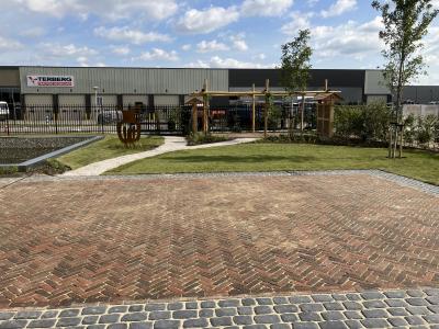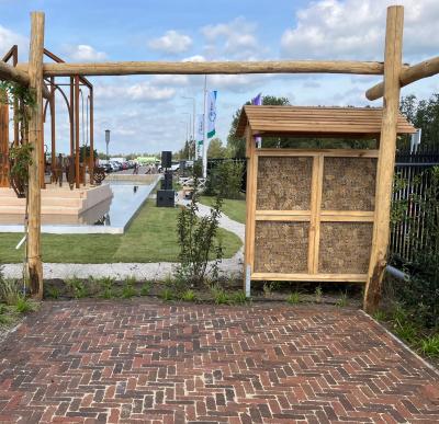 Een grote vijver aangelegd met mooie beplanting en bestrating.