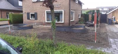 Tuin aangelegd voor een ouder echtpaar met bloembakken op hoogte.