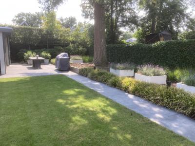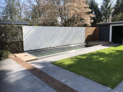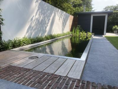 In een strak aangelegde villa tuin mag een zwemvijver niet ontbreken.