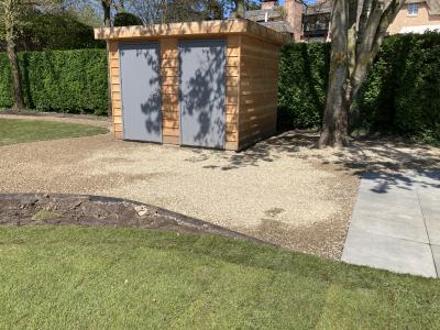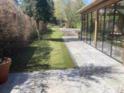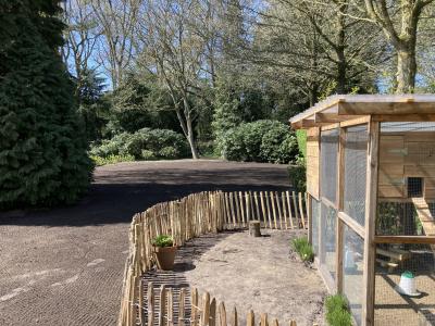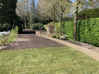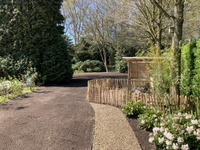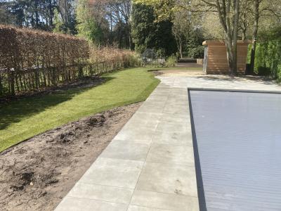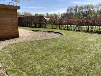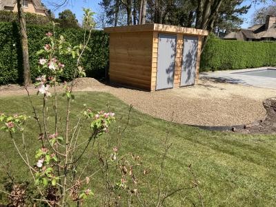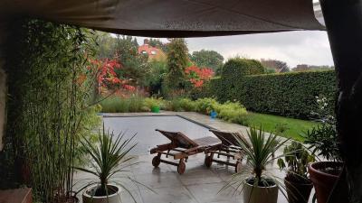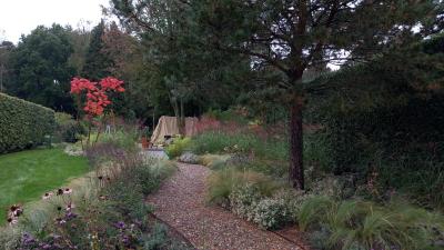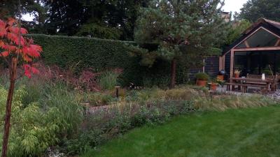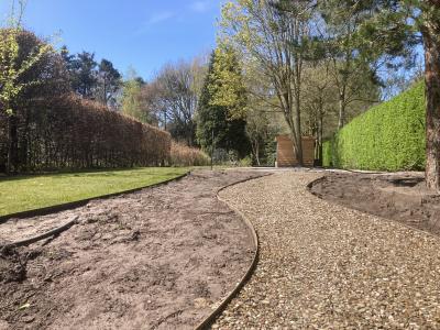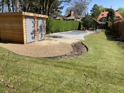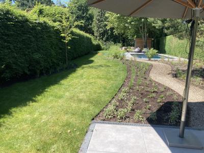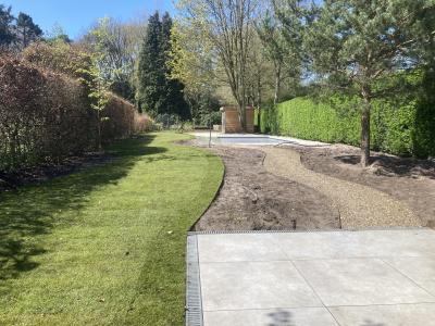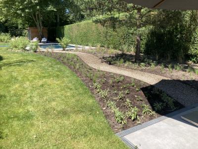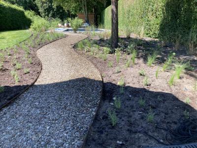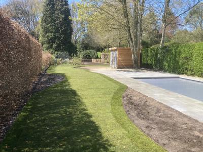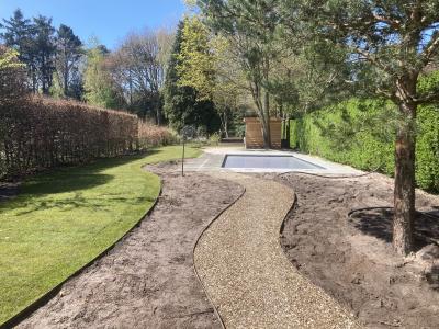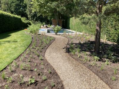 Mooi landelijke tuin met een zwembad en kronkelende paden.