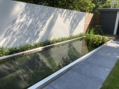In een strak aangelegde villa tuin mag een zwemvijver niet ontbreken.